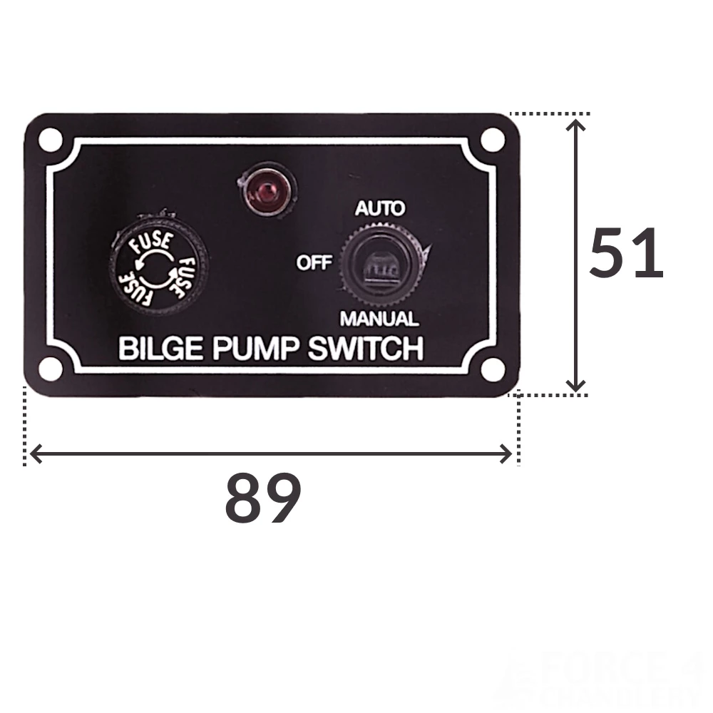 Bilge pump switch mounted in a sturdy 0.9mm thick aluminium plate. The toggle switch is waterproof and can be set to automatic or manual. The manual override setting has a spring return, so must be held in postion to work - the desired setup for most bilge pump applications as it prevents the pump from running dry without the operator knowing.