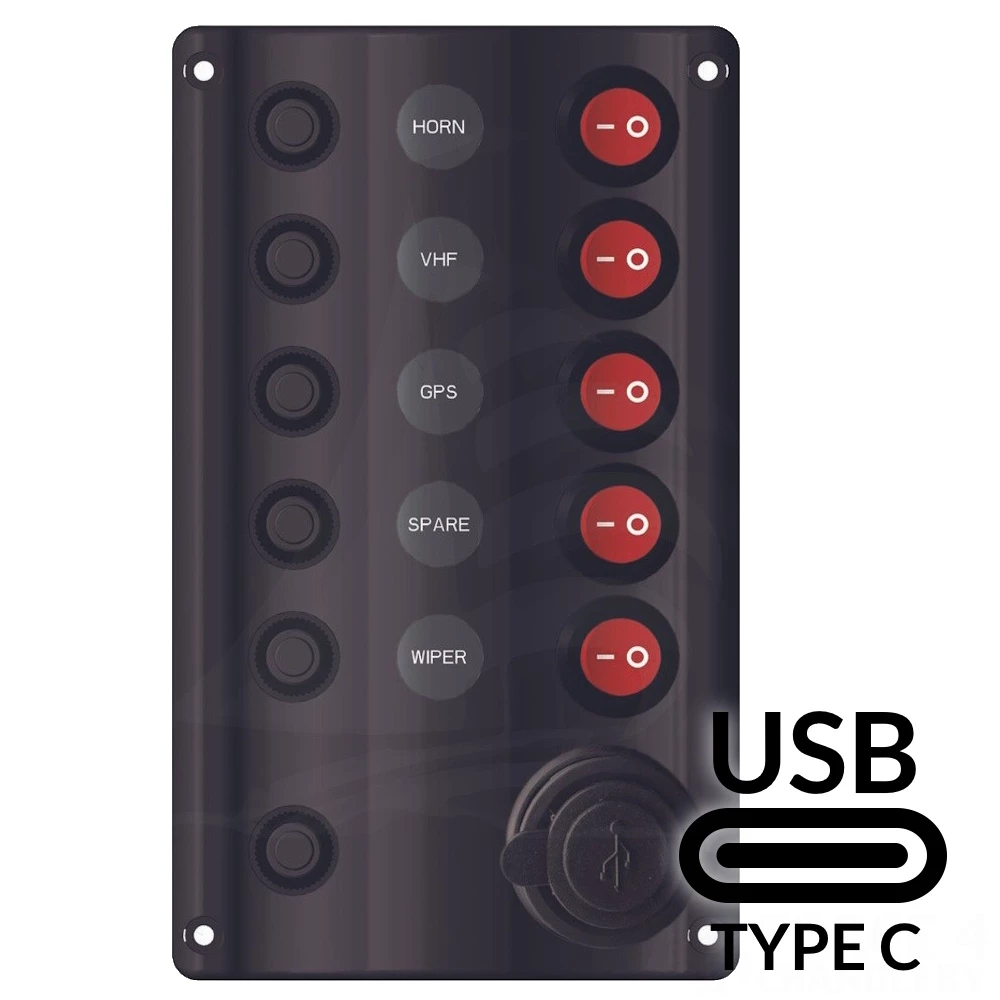 Wave design switch pannel with USB A & C charging points and 5 switches with LED indicator lights. The swicthes have breakers for safety.