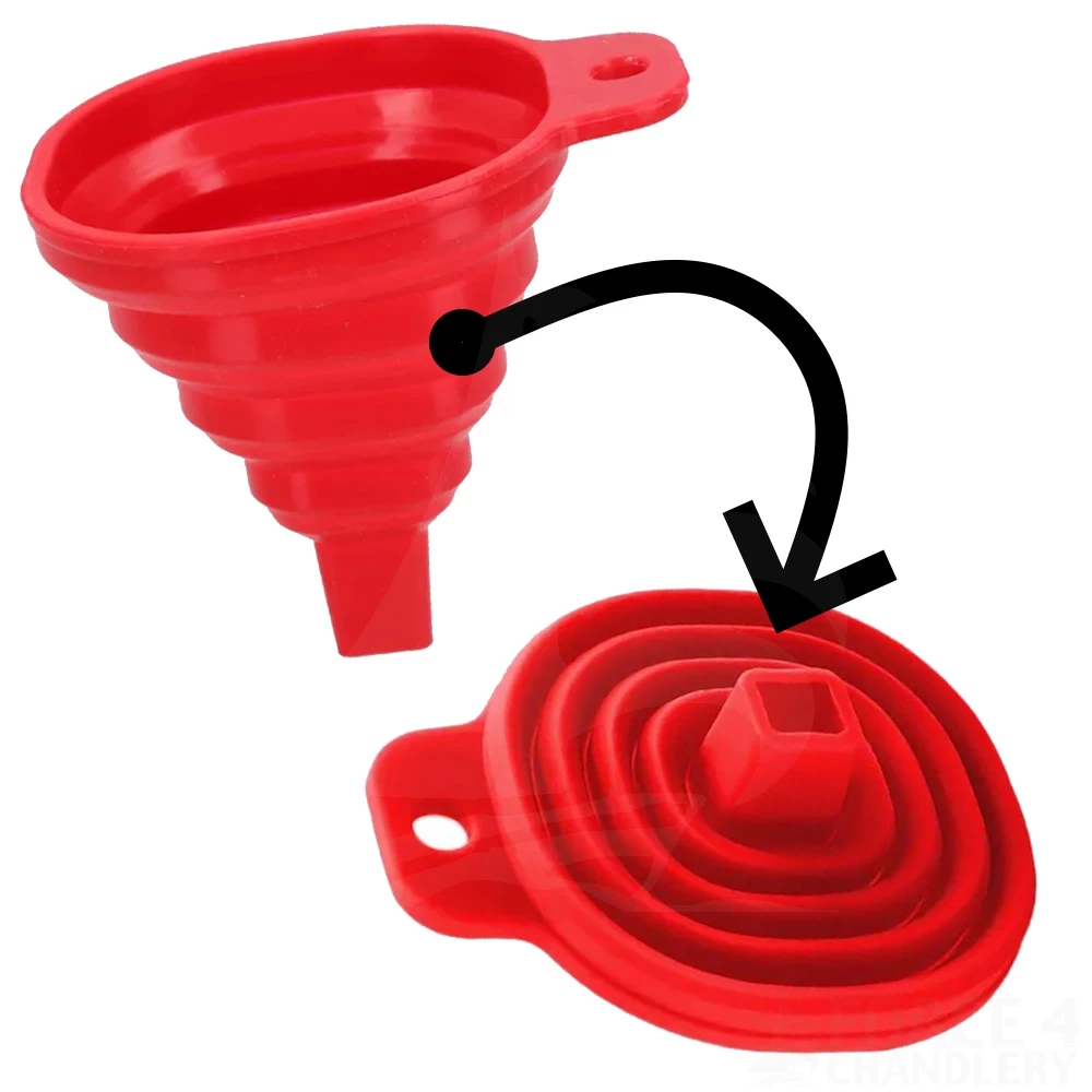 Collapsible silicone funnel, ideal for transferring non hazardous liquids. The bright red colour helps when trying to locate your funnel at the bottom of a locker or tool bag!