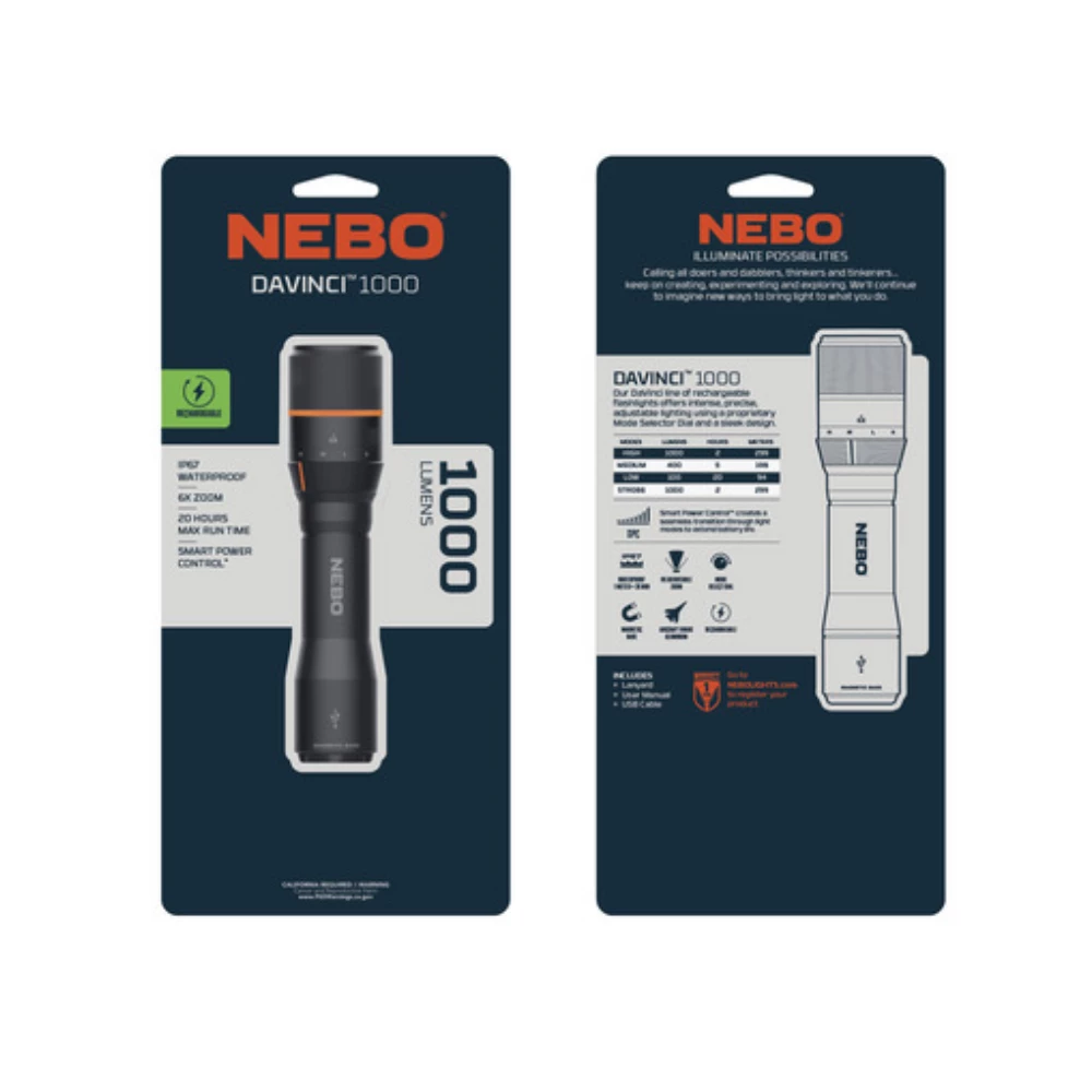 The DAVINCI 1,000 lumen rechargeable flashlight by NEBO is a powerful handheld flashlight with 4 light modes. The included mode selection dial makes it easy to switch between modes and the powerful LED in this flashlight can light up 299 meters. The included battery allows for up to 20 hours of operation in between charges.