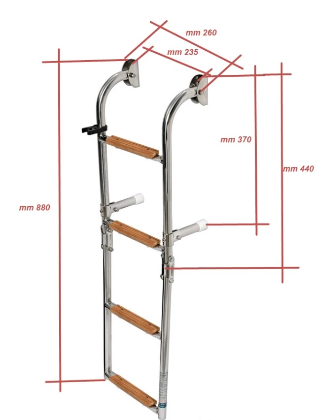 The ladder's foldable design and special joint allows for easy storage. With four wide steps and a lightweight construction, it’s perfect for hassle-free access to your boat.