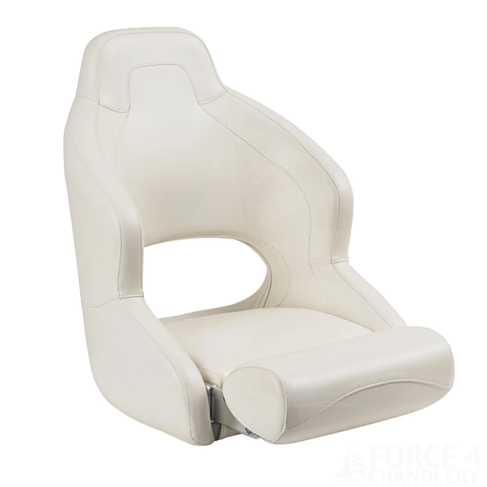 A strong and comfortable helm seat with a rotational moulded plastic core for strength. High density foam padding makes for a supportive seat and the flip-up bolster allows for standing at the helm too. Covered in a soft white vinyl, these seats look great and have a premium feel.