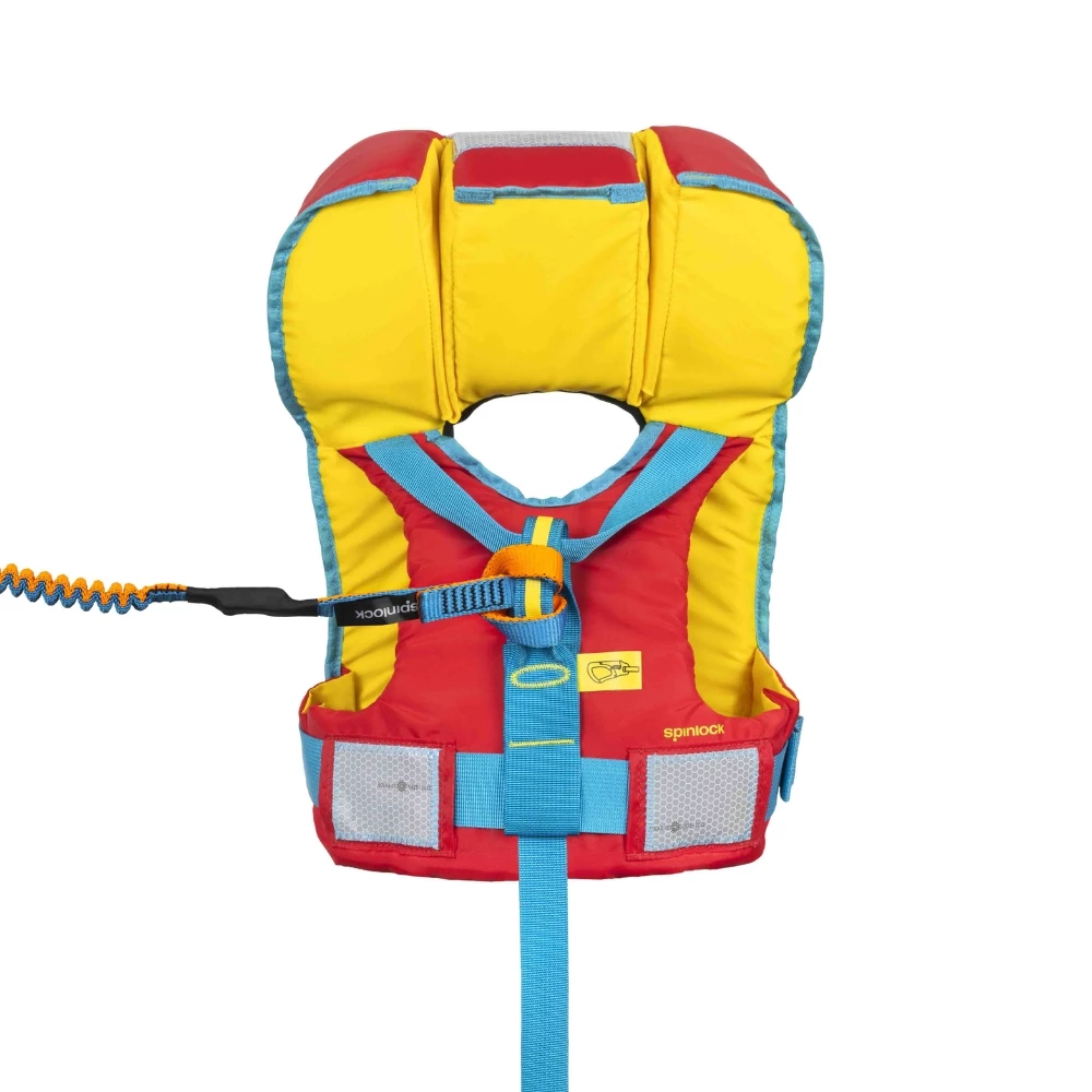 Key design features include a back-attached harness that secures the lifejacket without cluttering the front, keeping small hands away from clips and ensuring safety. The cleverly placed handles, both front and back, are easy to grab in emergencies yet designed to minimize snagging risks.